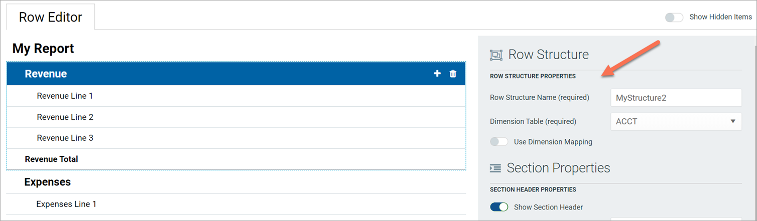 Certain parts of the row structure can be configured as hidden, such as section header rows or total rows. By default, these hidden items no longer display in the editor. If you need to view these items so that you can work with them and configure them, you can toggle the option Show Hidden items at the top right of the editor.