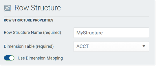 Enable this toggle switch if you want to map specific items in the dimension table to specific rows in the structure. When using dimension mapping, all row data is defined at the key column level of the dimension table, and each dimension item can only be assigned to a single row. The toggle switch shows as green when enabled and as gray when disabled.