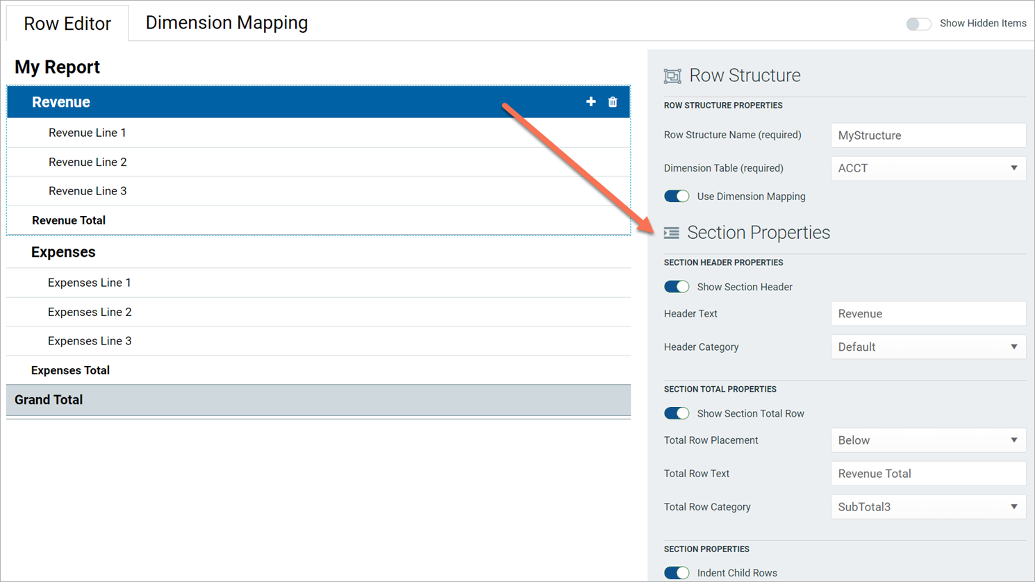 At minimum, the row properties define the label text for the row. If the structure does not use dimension mapping, then the row properties also define a data filter to determine the data to be shown on the row. For more information on defining the row properties, see Row properties.