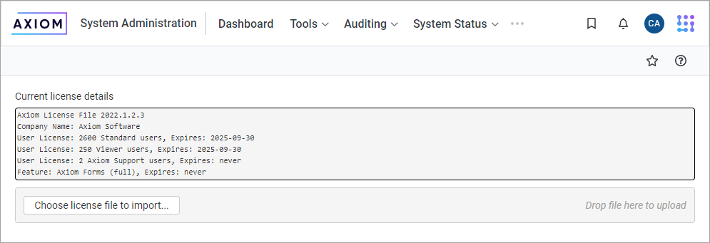 Axiom Support will provide you with a new license file if your organization has licensed new features, products, or users, or if your current license has been renewed. The new license file must be imported into Axiom Platform in order to take effect.