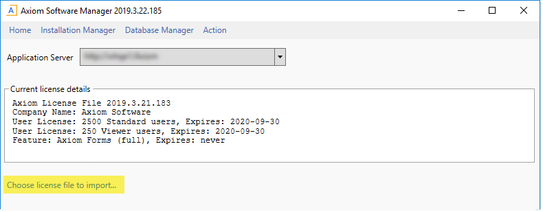 If needed, you can use the Axiom Software Manager on the Axiom Application Server to update the license file. This activity requires administrative permissions on the server, and is typically performed by your Information Technology department. You will need to provide your IT department with the license file provided to you by Axiom Support.
