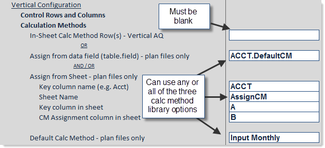 All calc method library assignment options are specified on the Control Sheet for the Axiom query. You must edit the Control Sheet directly in order to use the calc method library, because calc method library settings do not display in the Sheet Assistant. The options are located in the Vertical Configuration section of the Axiom query, in the Calculation Methods subsection. To use any of these options, the In-Sheet Calc Method Row(s) setting must be left blank.