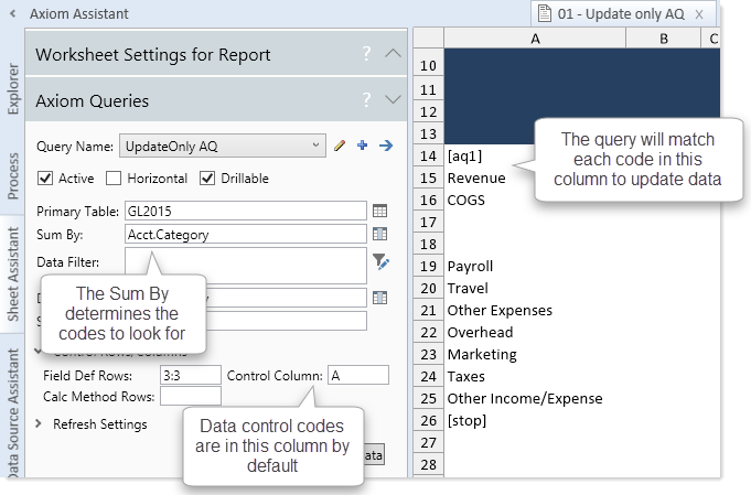 In the following example, the sum by for the query is Acct.Category and the insert control column is column A. When the query is refreshed, Axiom Platform checks column A for valid Acct.Category codes and then updates the row with the appropriate data for that code.