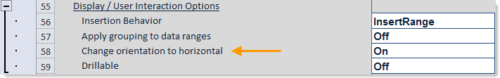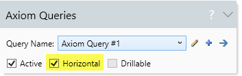 To configure an Axiom query as horizontal, set Change orientation to horizontal to On. In the Control Sheet, this setting is located in the Display / User Interaction Options section.