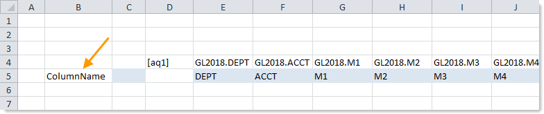 NOTE: In this example, we are querying the system table Axiom.Columns to return all columns for the GL2018 table, so "ColumnName" is a valid field definition code.