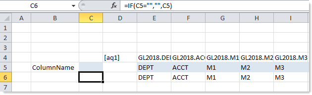 Instead, you can add a formula to the in-sheet calc method for the horizontal query, which copies the results down to the next row. In the following example, column C is the in-sheet calc method, and the formula has been placed in cell C6. The formula copies the horizontal query results in row 5 down to row 6 (and is configured to return blank if no content exists in row 5). Row 6 can now be specified as the field definition row for the vertical query.