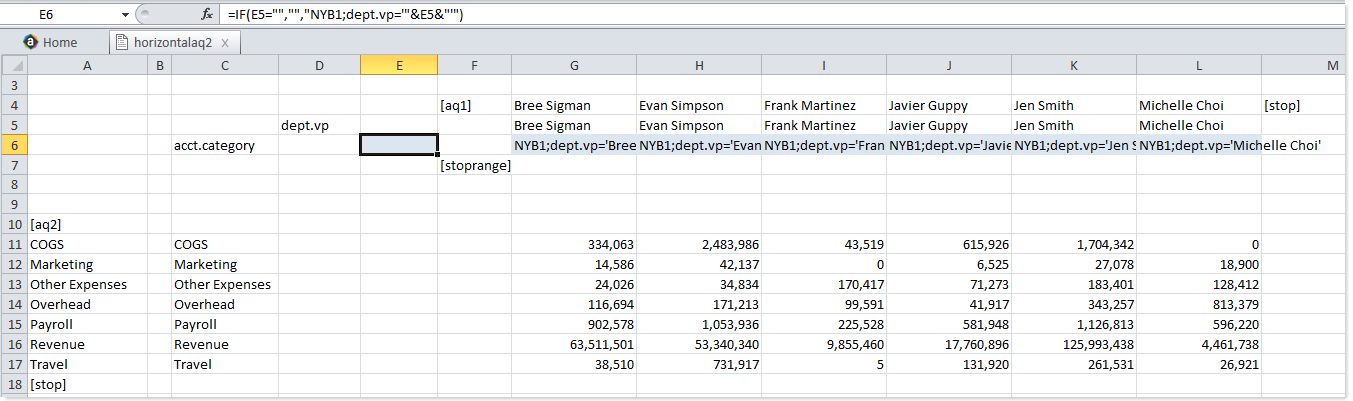 In the examples so far, the horizontal results can be used "as is" because they are column names. If you use the horizontal query to return something else, such as departments, then you need to use a formula to create a relevant field definition row for the vertical query.