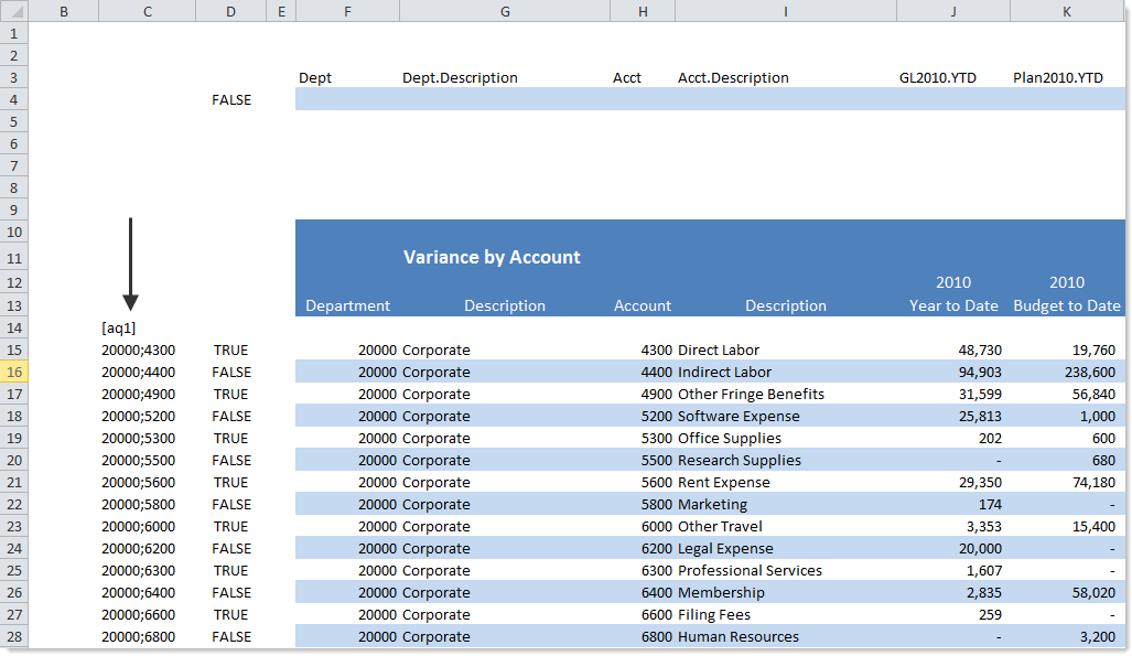 When the Axiom query is processed, data records are inserted after the cell marked with [aq#]. If the query is vertical, the records are inserted below the cell. If the query is horizontal, the records are inserted to the right of the cell.