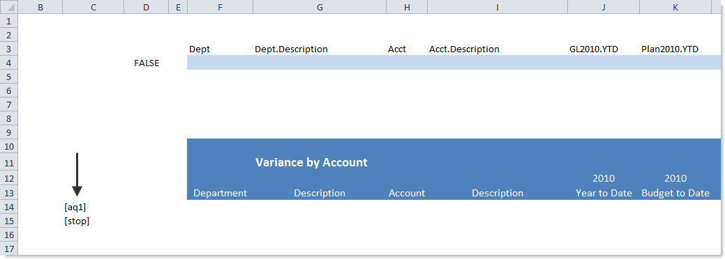 The following example is for a horizontal query. The first screenshot shows the insert control row before the Axiom query has been run. The designated row is row 3, and the [aq1] tag specifies where the data range will begin.
