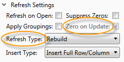 On the Sheet Assistant, you specify the desired refresh type as one of the following: Rebuild, Insert Only, Update Only, or Insert and Update. If an update option is selected, then you can specify whether zero is enabled by selecting or clearing the Zero on Update check box (by default, it is selected when an update option is selected).