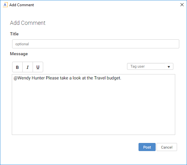 When you click Post, the comment is saved to the message stream, and any tagged users will be notified.
