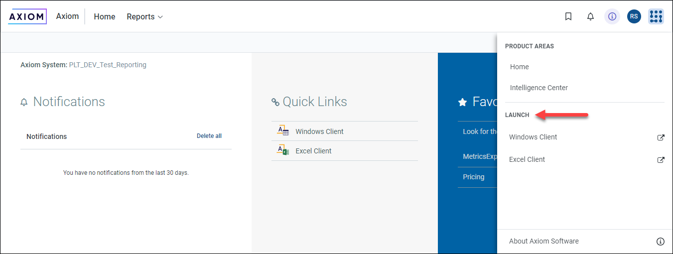 You can launch various Axiom Platform applications from the Area menu in the Web client, including the Axiom Excel Client and Axiom Windows Client.