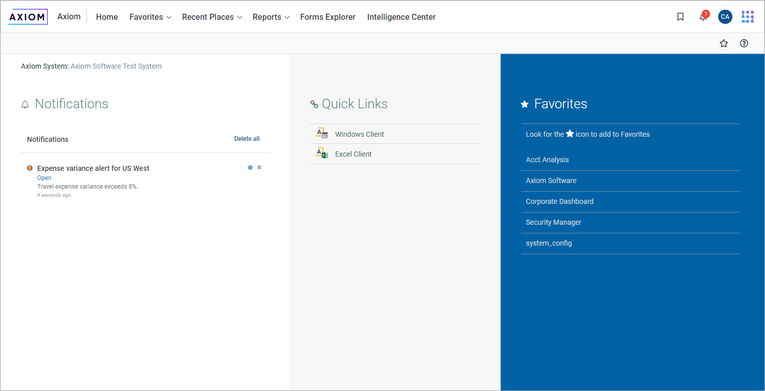 All users have a home page that opens automatically when you log in to Axiom Platform.