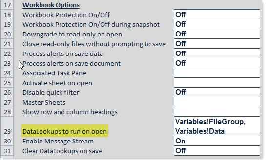 Additionally, you may want to set up your file so that the data lookup results are automatically cleared when the file is saved. This option is typically used in report files to help ensure that users do not see data saved in the file by other users. To do this, use the setting Clear DataLookups on save in the Workbook Options section of the Control Sheet.