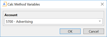 When the user inserts this calc method and the Calc Method Variable dialog displays, only the Account variable is visible.