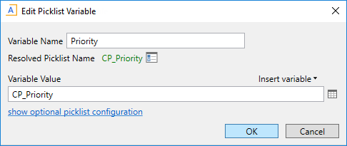 If the variable value resolves to an existing picklist table, then you can optionally click show optional picklist configuration to expose the advanced picklist settings. In this section, you can configure the following:
