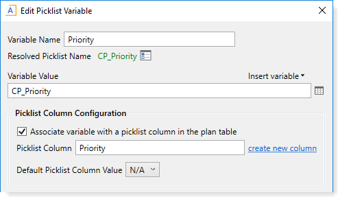 In the following example, the Priority picklist variable is associated with a column in the plan code table. That table has an existing column named Priority with a lookup to the CP_Priority picklist table, so that column is selected by default.