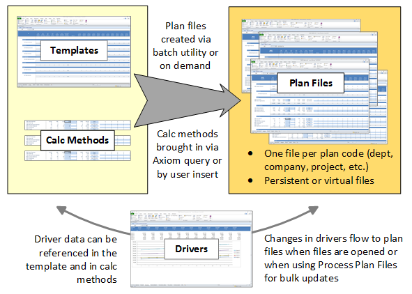 Plan files are automatically created using a combination of templates, calc methods, and driver data. Once the "base case" plan is created, department managers and other users can access their plan files to complete plan inputs and adjust planning data and calculations as needed (and as permitted by security). The resulting planning data is saved to the database from the plan files.