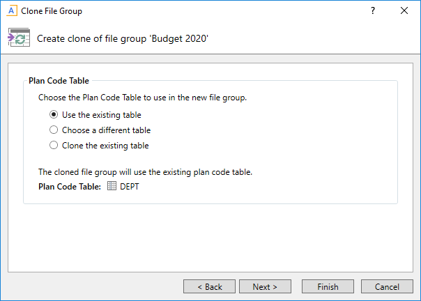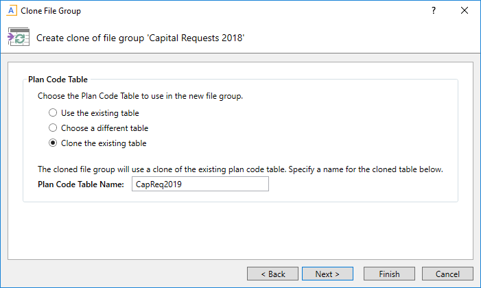 Clone the existing plan code table and use the new table for the new file group. Only the table structure will be cloned, not the data. This option is most commonly used when cloning an on-demand file group to start a new planning cycle, to create a new identity table with the same structure as the old identity table. For example, if the original file group uses CapReq2023, you want to clone that table and name it CapReq2024. |