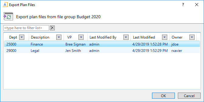 When a user clicks the Export Plan Files button, a dialog opens where the user can select one or more plan files to export. This dialog displays all plan files within the file group where the user has the appropriate level of permissions to perform the export (either read-only or read/write, depending on whether Require write access is enabled for the export command).