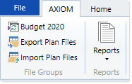 This example uses a custom Axiom ribbon tab for end users. The file group and the relevant commands have been added to the File Groups group. The "Current Budget" alias is being used instead of specifying a particular file group, so that the ribbon will dynamically update when the alias is updated.