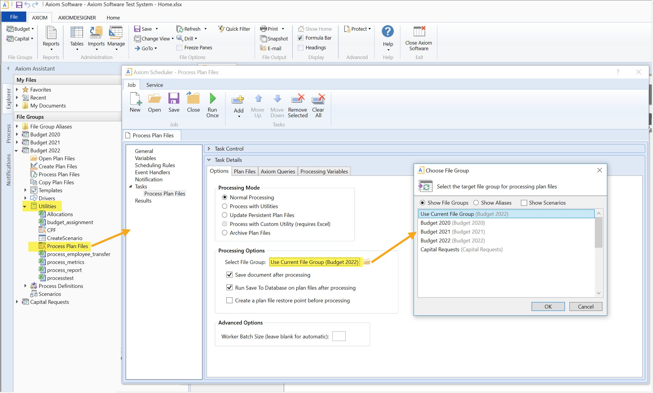 In the following example, a Process Plan Files task is configured to Use Current File Group, which is currently Budget 2022. If this file group is cloned, or if a file group scenario is created for the file group, this Scheduler job will be copied with the other utilities and it will automatically point to the new current file group.