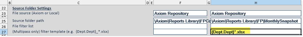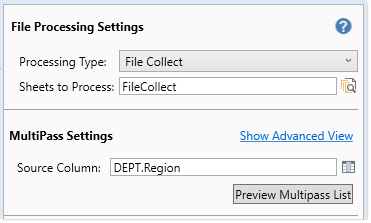 The easiest way to define multipass settings is to designate a Source Column. In this example, the source column is Dept.Region. When multipass processing is performed, the File Collect Configuration sheet will be iteratively processed over the values in the designated column (once per region). All enabled package columns will be processed once per pass.