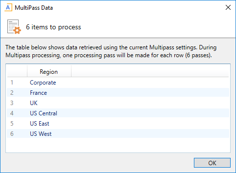 To confirm that the file will be processed using your desired list of items, click Preview Multipass List. A dialog opens, displaying the total number of items to process, as well as the list of individual items.