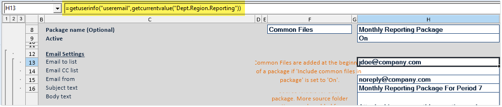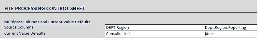 GetCurrentValue("ColumnName")returns the value in that column for the current pass. For example, the column Dept.Region looks up to the Region table, and the Region table contains a column named Reporting that holds the target user to receive the report package for each region. If the current pass is for region US West, the functionGetCurrentValue("Dept.Region.Reporting")returns the name of the user to receive the report package for that region.In order for GetCurrentValue to return a value for a particular column, that column must be used in the multipass settings, typically as a secondary source column. To add more source columns, you can use the advanced multipass settings in the File Processing task pane, or you can go to the File Processing Control Sheet (Control_FileProcessing) and add the additional source columns to the multipass section at the top of the sheet. When editing the File Processing Control Sheet directly, you can also specify default values that the GetCurrentValue function will return when multipass processing is not occurring.