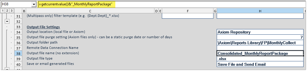 The following example shows GetCurrentValue being used to set the output file name, so that the file name changes for each pass. For example, when the pass is performed for region "US West", the name of the file will be resolved as "US West_MonthlyReportPackage". The function returns "Consolidated" when multipass processing is not occurring, because that is the current value default set on the File Processing Control Sheet (as seen on the previous screenshot).