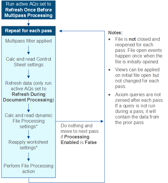 * Only certain file processing settings are re-read for each pass, and only certain worksheet settings are reapplied for each pass. See the following sections for more information.