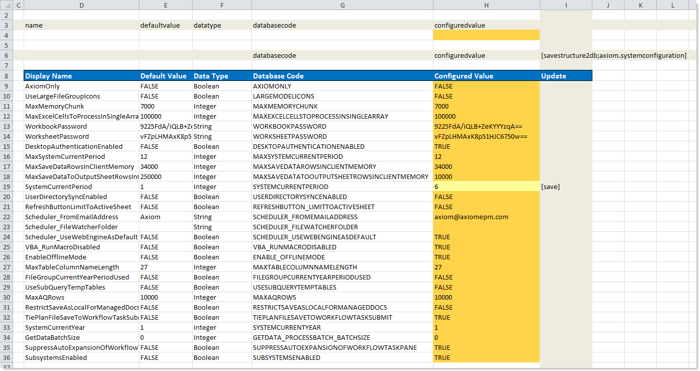 In the following example, the Axiom.SystemConfiguration table was queried to bring in the list of configuration settings (rows 3 and 4 are the Axiom query field definition and calc method respectively). We then changed the configured value for the SystemCurrentPeriod and flagged that row to save. For the Save Type 4 process, Row 6 is the save-to-database control row and column I is the control column.