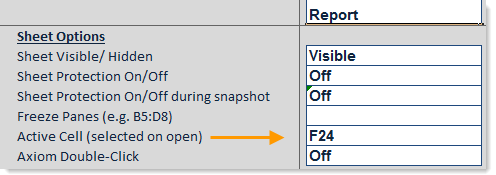 To set the active cell for a sheet, use the Active Cell option, located in the Sheet Options section of the Control Sheet. Enter the desired cell address, such as F24.