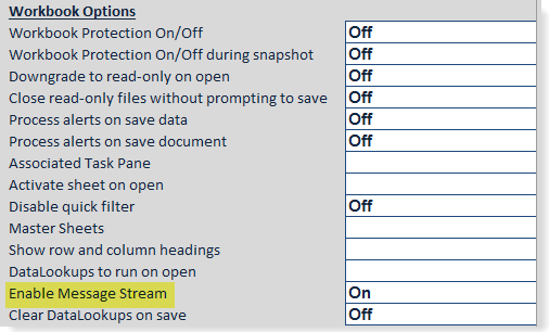 The message stream is enabled or disabled on a per file basis. The availability of the message stream for a document is controlled by the Enable Message Stream setting on the default Control Sheet. You can set this to On or Off as needed for each Axiom file.
