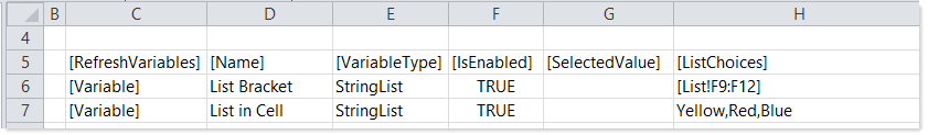 The following screenshot shows a couple of StringList refresh variable examples. The first example reads the list from a cell range, while the second example uses a comma-separated list.