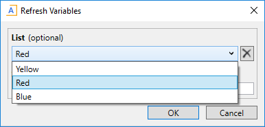 StringList refresh variables prompt users to make a selection from a predefined list. This list is manually defined within the current file—either in the RefreshVariables data source itself, or in a range of cells that are then referenced in the data source.
