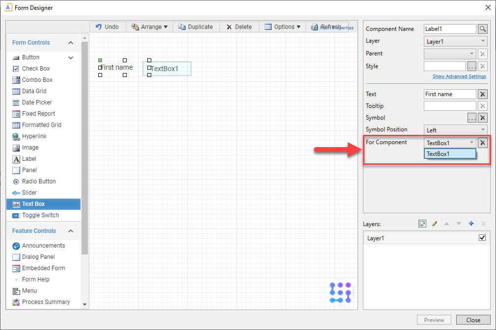 In the For Component drop-down, click the input field component to associate with the selected label.