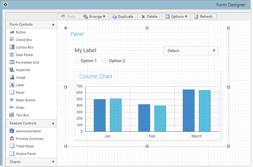 This screenshot shows an example Panel component in the Form Designer. This panel has several child components such as a label, radio buttons, combo box, and a chart. As the panel is moved on the canvas, the child components move with it.