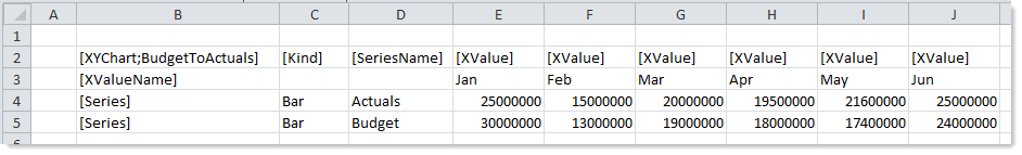 To use the Data Source Wizard to add the tags to a sheet, right-click in the cell where you want to start the data source and then select Create Axiom Form Data Source > Bar Chart. If the data already exists in the sheet, you can first highlight the labels and the values (in the example above, you would highlight D3:J5) and then use the wizard. Axiom Platform will add the tags as displayed in the example above, including adding the [Kind] column. The cells in the row above and the column to the left of the highlighted area must be blank in order for Axiom to place the tags in sheet.