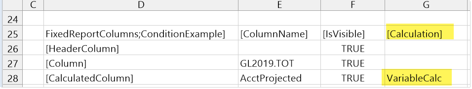 To use this data source in the report, you would create a [CalculatedColumn] row in the FixedReportColumns data source, and then enter the name of the ConditionalCalculation data source name into the [Calculation] column. In this example, you would enter VariableCalc.