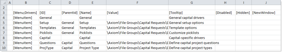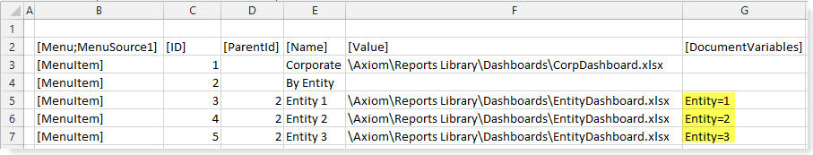 The following example shows a Menu data source using parent IDs to create multi-level menus. In row 4, the General menu item is a top-level parent item because it does not have an assigned parent ID. In row 5, the Setup menu item is assigned General as a parent ID, so it will display underneath the General menu item (as will the items in rows 6 and 7).