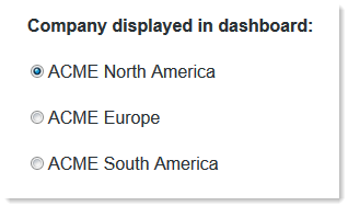 The radio buttons would display as follows in the Axiom form. In this case, the ACME North America button is selected by default (due to enabling Is Selected in Group). The user can click on another radio button in this group to select that option and clear the ACME North America option.