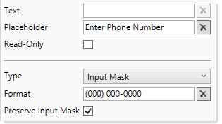 The inputted text always displays in the text box using the defined format mask. The value submitted back to the source file is either formatted text (exactly as shown in the text box) or raw text (only the user input with no formatting), depending on whether Preserve Input Mask is enabled.
