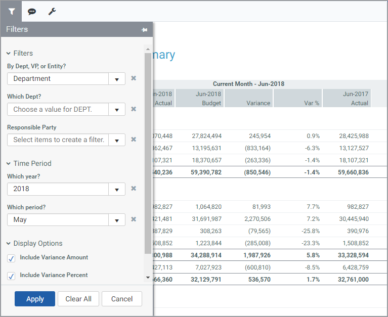 This topic provides information on how to set up an Axiom form to use refresh variables, including details on what occurs during the data refresh. For more information on how users interact with the Filters panel, see Filtering data in Axiom forms.