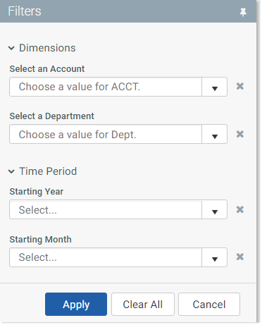 If the form is opened as a web tab within the Desktop Client General term for using either the Excel Client or the Windows Client, both of which are installed to the user's desktop., the Filters panel is open and pinned by default. If the user wants to close the Filters panel, they must either unpin the panel or click the filter icon.