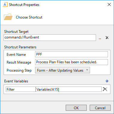 In the Shortcut Properties dialog, the RunEvent command is now listed as the shortcut target, and the relevant shortcut parameters are now available.