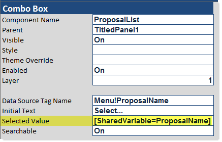 Where the combo box is used to select a Proposal name. If Proposal "Workspace Remodel" is selected from the list, this value becomes the current value for the shared variable ProposalName. GetSharedVariable functions in all of the forms in the shared form instance will return this new value.
