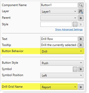 - For the Drill Grid Name, select the name of the Formatted Grid component that you want to drill using the button. In the example below, the grid has been named "Report."