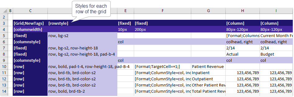 For each column in the grid that is tagged with either [Fixed] or [Column], you can enter one or more style names in the [ColumnStyle] row(s).