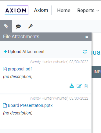 To open the File Attachments panel, users can click the attachments icon